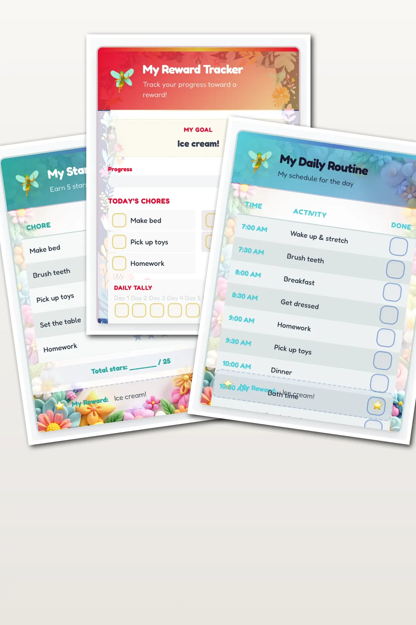 Serene Fairy Daily Routine — a watercolor style routine schedule with fairy theme. Unique colors and layout for kids.